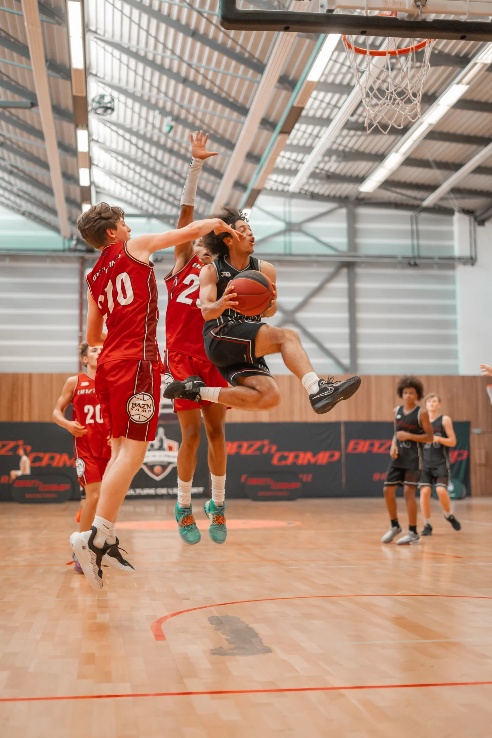 Players aged 14 to 23 can join our team in the United States: Los Angeles, San Francisco, or Orlando. The Baz'n team will play games against American schools and academies, benefit from training sessions, and attend an NBA game.